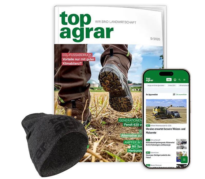 **Falls Du top agrar nicht weiterlesen möchtest, sende bitte innerhalb von 14 Tagen nach Erhalt der letzten Ausgabe eine Mitteilung an top agrar Leserservice, 48084 Münster. Die Lieferung wird dann sofort und ohne weitere Verpflichtung eingestellt. Oder Du liest top agrar ohne Risiko weiter und kannst Dein Abonnement jederzeit kündigen. Zu viel bezahlte Beträge erhältst Du zurück. Die Jahresbezugspreise 2025 (Inland): top agrar Print + Digital Basis 159,60 EUR, mit dem Spezialprogramm Rind oder Schwein 169,80 EUR, mit beiden Spezialprogrammen 179,40 EUR. top agrar Digital 139,80 EUR. Preise inkl. Versandkosten und MwSt. Auslandspreise auf Anfrage.